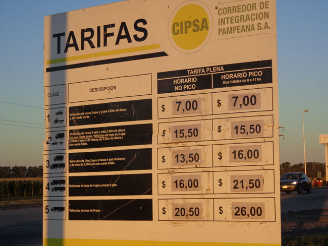 Vehículos de más de 6 ejes _____$ 20, 50 (horario no pico) – $ 26 (horario pico)