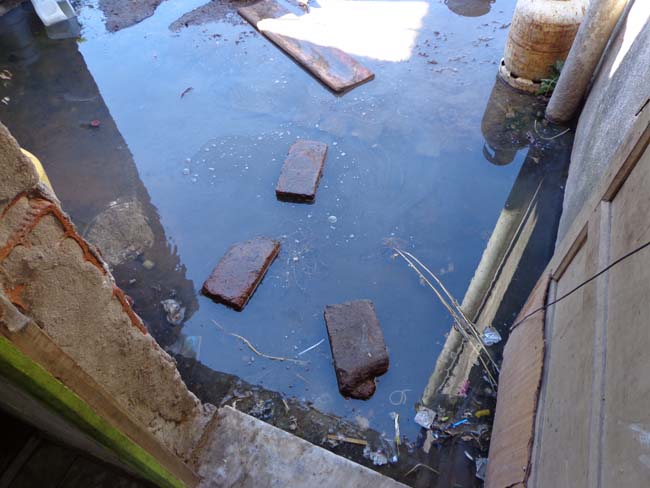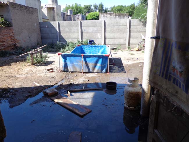 En el patio de su casa se ha formado un gran charco de líquidos (y algunos sólidos) cloacales que ocupan casi un cuarto de la superficie, esta situación la padecen, ella y su familia, desde hace aproximadamente un mes.