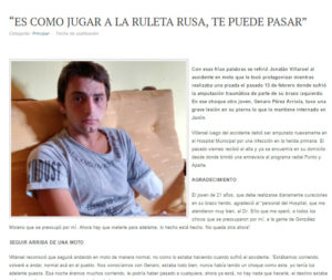 El joven de la entrevista se llama Jonatan Villarroel, vive en la vecina ciudad de América; el pasado 13 de Febrero sufrió un accidente en moto mientras corría picadas, lo que le costó la amputación traumática de un brazo.