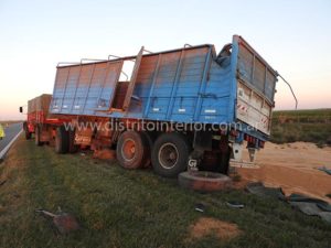 La carga quedó derramada sobre el préstamo y el acoplado volcado sobre un lateral, sin consecuencias para el chofer.