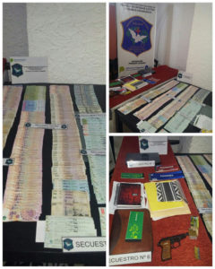 «Durante la jornada de ayer (10-05-17) personal policial de la DELEGACION DEPARTAMENTAL DE INVESTIGACIONES DEL TRAFICO DE DROGAS ILICITAS y CRIMEN ORGANIZADO TRENQUE LAUQUEN/PEHUAJO, conjuntamente con efectivos de la COMISARIA COMUNAL DE GENERAL VILLEGAS, procedieron en la calle Castelli y Puyrredon, a la interceptación de un automóvil Toyota Corolla y allí demorar preventivamente a una persona realizando sobre el mismo una requisa personal y el secuestro de efectos.- El motivo de la interceptación resulto ser el procedimiento inicial a varios allanamientos ordenados por S.S. Dr. HECTOR PEDRO PLOU, Juez Federal de Junín, en el marco de una causa federal que se investigada desde hace varios meses por delitos contra el orden económico y financiero desde la Fiscalía Federal de Pehuajo a cargo de la Sra. Fiscal Dra. MARIA CECILIA Mc INTOSH, quien estuvo presente junto a su secretario supervisando dichas diligencias, en la que se sospecha movimientos de dinero e inversiones comerciales de significativos montos de manera irregular y de orígenes dudosos, siendo así que durante todo el día e inclusive la madrugada la policía trabajo realizando los allanamientos sobre inmuebles situados en la calle Sarmiento (domicilios particulares y dos comercios), como así también registros vehiculares, pudiendo secuestrar en dichas diligencias importantes sumas de dinero en efectivo (pesos y dólares), un arma de fuego (pistola calibre 22 con proyectiles) carente de documentación, cheques de distintas entidades bancarias y cuentas corrientes los cuales en la sumatoria superan ampliamente el medio millón de pesos, soportes informáticos, biblióratos con documentación y demás elementos de interés para la investigación.- Luego la persona investigada fue trasladada a la dependencia policial local a fin de ponerlo a disposición de la justicia, donde fue notificado de la imputación penal en el marco de la cusa que se le sigue y demás recaudos legales de rigor.-«