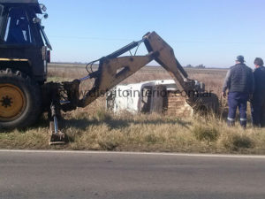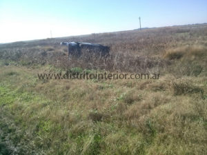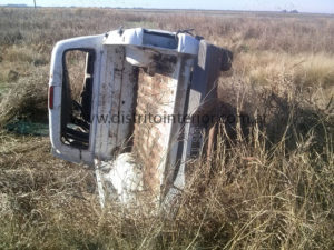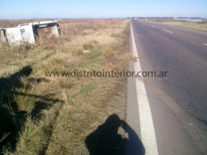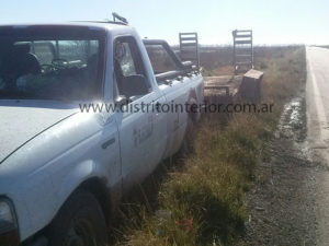 Al parecer el estado de la ruta obligó al conductor de la pick up a maniobrar bruscamente en más de una oportunidad hasta que a la altura de la estancia La Ema, la carga cedió y cayendo hacia la mano contraria se desplazó hasta la banquina quedando tal como se lo observa.