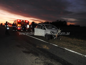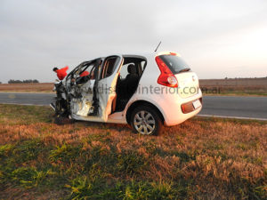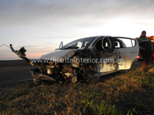 Tal como informáramos, el auto que se movilizaba en sentido Villegas – Ameghino impactó contra la rueda delantera del camión, luego dio contra el pecho del acoplado, saliendo despedido, dando varias vueltas con las consecuencias que están a la vista y golpes para sus ocupantes.