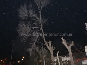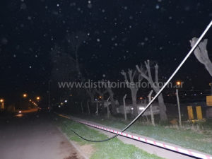 Obreros contratados por la empresa estaban podando los árboles cuando un gajo de gran tamaño cayó sobre el cable de Telecom produciendo el quiebre de una palmera ubicada sobre la misma arteria en cercanías de Berutti.