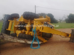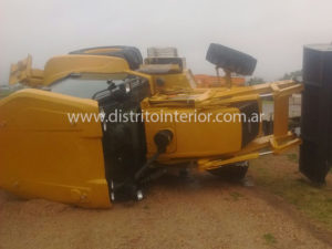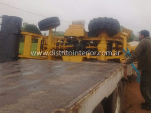 La maquinaria que había sido transportada hasta la firma Agro Vial Villegas estaba siendo descargada del camión cuando se precipitó volcando tal como se la aprecia.