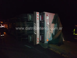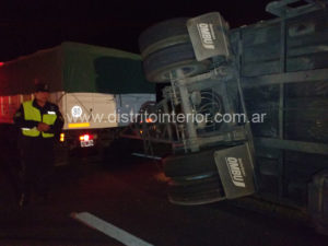Por su parte, Perez no pudo evitar que el acoplada volcara sobre el esfalto, desparramando su carga, producto de la brusca maniobra.