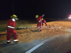 Como consecuencia, la ruta permanecía cortada hasta que los bomberos de general Villegas y Ameghino retiraran los granos y el acoplado que impedían el normal tránsito.