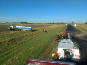 El luctuoso hecho tuvo lugar esta tarde en el kilómetro 347 de la ruta N° 5 en momentos que un camión Volvo que transportaba gas, se encontraba detenido sobre el asfalto dado que en el lugar se encontraba un banderillero por la obra que allí se realiza.