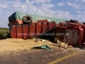 Por causas que se trataban de establecer, el chofer perdió el control, el acoplado que, al igual que el chasis, viajaba cargado con soja, hizo tijera provocando el vuelco del último.