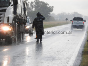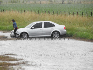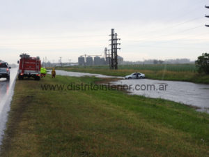 El auto que quedó dentro del agua no pudo salir por sus propios medios y due necesaria la intervención de Bomberos Voluntarios que intentaban su retiro, mientras un efectivo de la Policía Caminera controlaba el tránsito.
