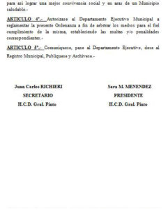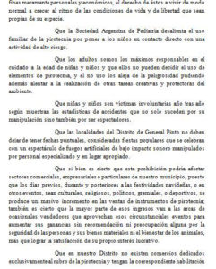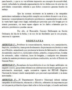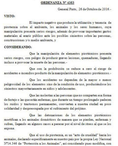 Se trata de la Ordenanza Nº 4353, la cual prohíbe el uso de «Pirotecnia», sancionada en Octubre de 2016.
