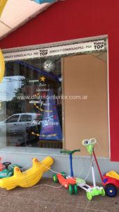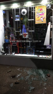 A media cuadra de lo informado en el centro Empleados de Comercio, otro comercio, en este caso una bicicletería, fue vandalizada a piedrazos, siendo alcanzado en sus vidrios con las consecuencias que están a la vista.