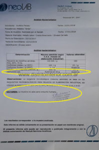 Por tal motivo, el responsable de la firma Grido en General Villegas, Gustavo Pereto, facilitó a Distrito Interior la copia del análisis, realizado precisamente por Neolab y entregado a la autoridad bromatológica local.