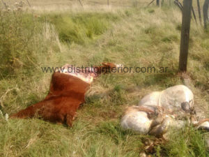 El ganado (vaquillonas y terneros), fue atacado por «desconocidos» en menos de un mes, principalmente en el establecimiento rural perteneciente a Santiago Cortaberría, ubicado en cercanías del alteo de protección que se construye detrás del predio ferial de la Sociedad Rural, entre la ciudad cabecera y la localidad de Elordi.