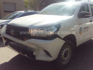 Ambos vehículos se movilizaban por Vieytes casi Pueyrredón. La Toyota Hilux conducida por personal de ex Nidera no pudo frenar e impactó a la altura del estribo provocando la caída de un hombre de apellido López quien fue trasladado al nosocomio local con un fuerte golpe en una de sus piernas.