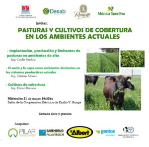 Se trata de una charla abierta y gratuita que tendrá lugar en el salón de la Cooperativa Eléctrica a las 19:30 hs. organizada por Mónica Spertino y su equipo, que contará con la disertación de ingenieros de INTA, donde los temas centrales serán pasturas y cultivos anuales en función de los ambientes actuales