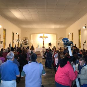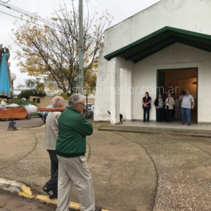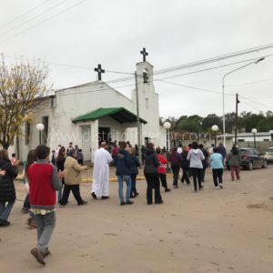 Esta tarde pasadas las 14:00 hs. los fieles recorrieron algunas de las calles del barrio limitando el recorrido por el temporal, llegando al lugar de partida donde se celebró la misa.