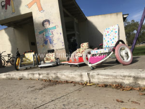 Mientras se realizaba la entrega a escasos metros, otro grupo de alumnos de la misma escuela visitaba el lugar junto a su profesor para observar y obtener información acerca de una bicicleta adaptada, construida hace algún tiempo por un villeguense, con la que pueden pasear los pacientes pacientes.
