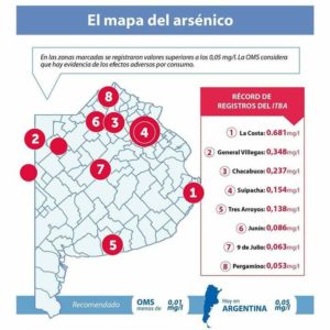 Un mapa que realiza desde hace siete años el Instituto Tecnológico de Buenos Aires (ITBA) junto a la ONG NutriRed (www.nutrired.org/tag/mapa-arsenico/) revela que la distribución del arsénico en el agua afecta mayormente al centro, norte y Conurbano bonaerense; aunque tampoco es ajeno al sur y a localidades costeras.