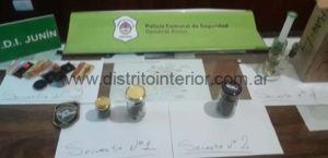 El resultado fue el hallazgo de papeles para armar cigarrillos, una pipa de agua y tres frascos de vidrio conteniendo en su interior marihuana (20 grs.).