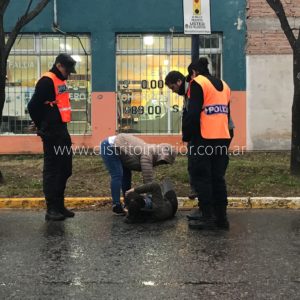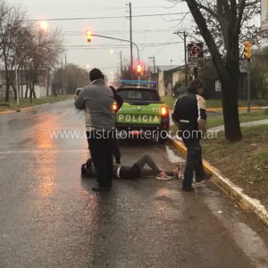 La escena es de la esquina de Mitre y Rivadavia a las 17:00 hs., hace unos 20 minutos, una joven mujer cayó junto a otra persona cuando circulaban a bordo de una moto que no se halla en el lugar, ya que el compañero continuó su recorrido. Al parecer se dirigían hacia la escuela.
