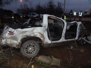 Por causas que se tratan de establecer, llegando al acceso de Rancúl, la camioneta chocó contra un bulevar, “una especie de dársena” que divide la ruta. La Toyota Hilux perdió el control y comenzó a dar varios tumbos.