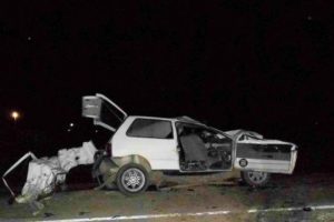 Producto de la violenta colisión entre ambos vehículos ,el Fiat Uno, quedo sobre la banquina de la mano de circulación por donde circulaba, en tanto el Volkswagen Gol, finalizo volcado varios metros después sobre la zona de préstamo de su mano de circulación.