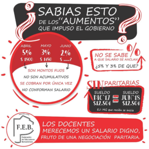 Según el informe realizado por la FEB, un Maestro de Grado con 10 años de antigüedad, percibió un anticipo de $4.500 estipulado para el primer semestre de 2018, tal como lo estableció unilateralmente el gobierno de la provincia de Buenos Aires.