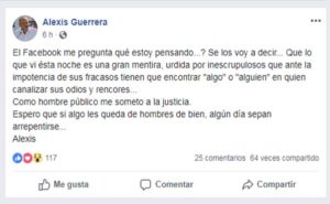 «El Facebook me pregunta qué estoy pensando…? Se los voy a decir… Que lo que vi ésta noche es una gran mentira, urdida por inescrupulosos que ante la impotencia de sus fracasos tienen que encontrar «algo» o «alguien» en quien canalizar sus odios y rencores…