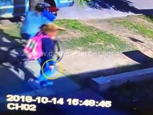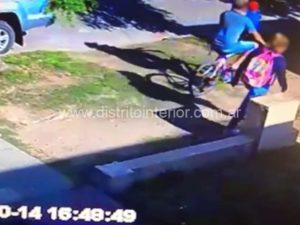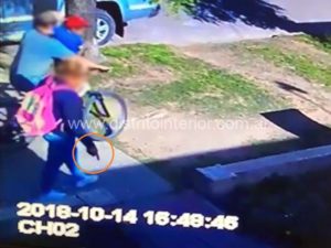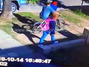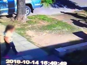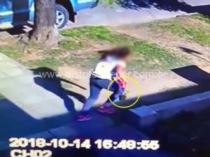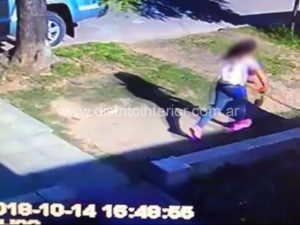 Una mujer camina por la vereda sobre la calle Belgrano junto a un hombre y un pequeño de muy corta edad que se movilizan en una bicicleta; al observar la mano derecha de la mujer se advierte (luego de ver lo que ocurre posteriormente) cómo con su dedo índice señala hacia el suelo. Posteriormente se ve a la niña que caminando detrás, se detiene, mira hacia el objetivo, se agacha y al levantarse no logra tomarlo, por lo tanto en un segundo intento lo logra y con éste en la mano emprende la retirada corriendo (todo sucede en segundos).