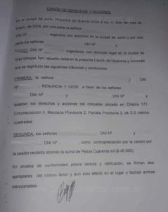 En esta oportunidad, una mujer con domicilio en Junín, presuntamente la titular, renunciaba y cedía a la pareja la parcela indicada existente en la llamada Ex Quinta Migliore, los que a modo de contraprestación abonaban $ 40.000. El acto se llevó a cabo el 11 de Enero del corriente año, de acuerdo a lo que consta.