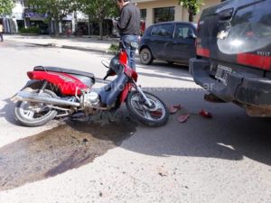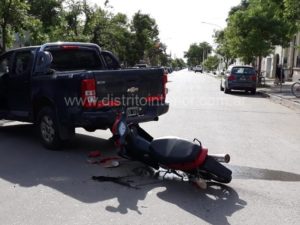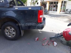 Este martes cerca de las 9:00 hs. una moto Corven 110 cc. que era conducida por una mujer identificada como Andrea Roman, de 22 años chocó contra una camioneta a la altura del guardabarro trasero izquierdo que maniobraba en reversa cuando salía de un garage. El conductor era Carlos Farías.