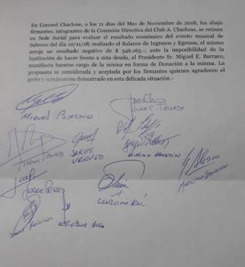 «En Coronel Charlone, a los 11 días del mes de Noviembre de 2018, los abajo firmantes, integrantes de la Comisión Directiva del Club Atlético Charlone, se reunen en Sede Social para evaluar el resultado económico del evento musical de Sabroso del día 10/11/2018; realizado el Balance de Ingresos y Egresos, el mismo arroja un resultado negativo de $ 546, 165. Ante la imposibilidad de la institución de hacer frente a esta deuda, el Presidente Sr. Miguel E. Barracco manifiesta hacerse cargo de la misma en forma de donación a la misma. La propuesta es considerada y aceptada por los firmantes quienes agradecen el gesto y compromiso demostrado en esta delicada situación.»