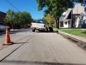 El inconveniente se produjo cuando pasó el badén que se encuentra en la intersección quedando sin posibilidades de continuar, en el estado y posición que se la observa.