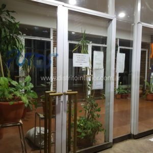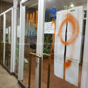 El colegio luce con las inscripciones «PUTOS» y «IMI 19» en sus vidrios de la puerta de ingreso.