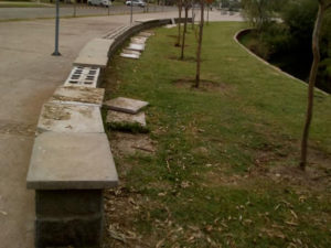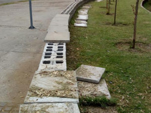Las lajas de uno de los tapiales cercanos al ingreso de la calle Azcuénaga y Berutti que se observaban en el suelo podían estar allí por obra o vandalismo. lamentablemente fue por lo último.