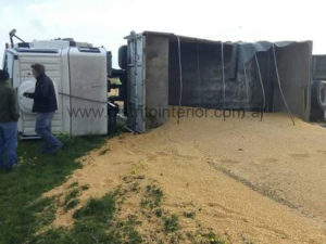 El rodado que tiraba un acoplado cargado con soja viajaba desde nuestra ciudad a bahía Blanca, quedó sobre la ruta impidiendo el tránsito sobre la misma con toda la carga desparramada.