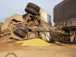 Al pasar muy cerca de la profunda cuneta el peso del acoplado hizo que cediera el camino y se precipitara hacia uno de sus laterales desparramando parte de la carga, quedando a su vez volcado dentro prácticamente con las cuatro ruedas hacia arriba.