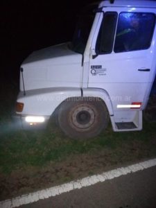 En el kilómetro 418 de la ruta 33 el camión Mercedes Benz con una tolva, cargado, propiedad de Alejandro Paviolo, conducido por Andrés Butrón perdió accidentalmente una de las ruedas traseras quedando la mitad del chasis en sobre la ruta.