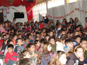 La cita fue este sábado por la tarde; la invitación, que los niños disfrutaran de la proyección de una película (Toy Sotory 4) y una merienda con tortas, masitas y chocolate, pero la respuesta fue multitudinaria y la acción se multiplicó por dos ya que debieron realizarse dos funciones.