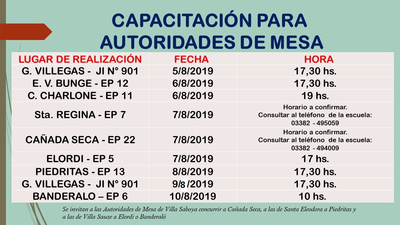 Mediante el siguiente cronograma se informa fechas, horarios y lugares, tanto en ciudad cabecera como en los pueblos del distrito para la capacitación de las autoridades de mesa de cara a las elecciones PASO del próximo 11 de agosto.