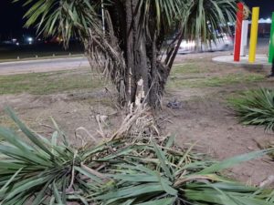Gatica circulaba hacia la ruta 188 cuando a la altura del hotel Océano se desvió hacia su izquierda golpeó y subió el cordón impactando de lleno contra una palmera. la violencia del choque lo desvió nuevamente hacia la traza dejándolo en sentido contrario al de circulación, muy golpeado en el rostro.