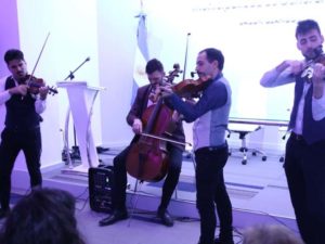 El acto inaugural tuvo en su comienzo como escenario el balcón frontal sobre las escalinatas de acceso, donde el cuarteto de cuerdas Sul Tasto interpretó temas populares frente al público instalado en la vereda y la avenida Alsina.