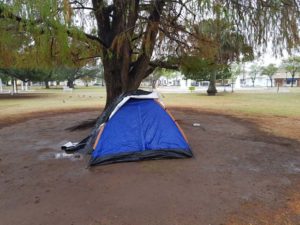 A la vista esta mañana temprano no se observaban manifestantes, pero la carpa está armada y cubierta con un plástico tipo silobolsa con el que es resguardada de la lluvia que comenzó a caer en la medianoche con un poco mas de fuerza.