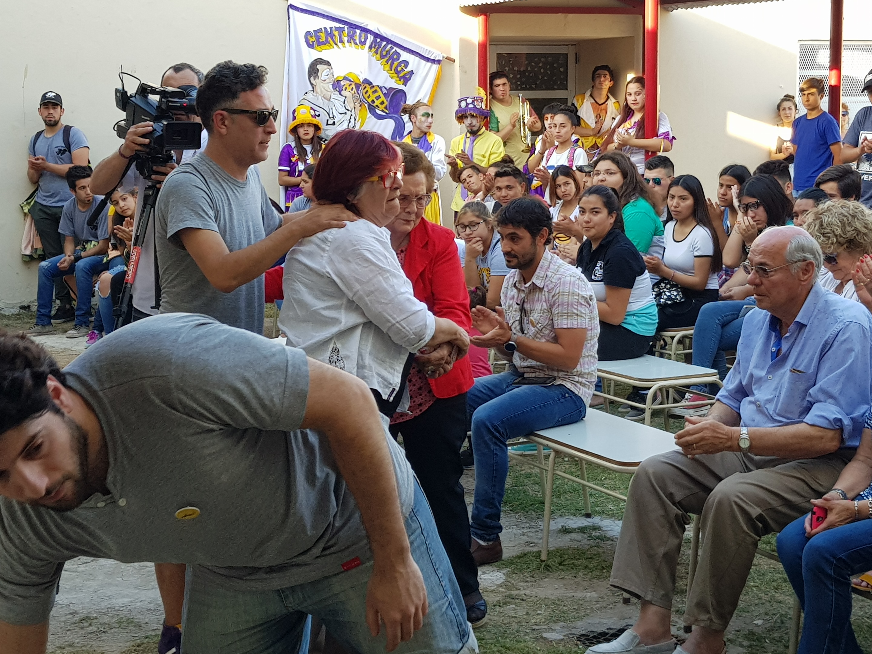 La imagen las muestra abrazadas por un instante, el momento en que era descubierta una placa con el nombre de Jesús que identificará al SUM de la escuela N° 8, que justamente se llama «Fabian Siri».