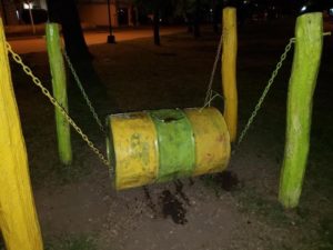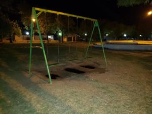 «Buenas noches Fernando. Soy una vecina del barrio Banco Provincia, vengo a traer a mi hijo a disfrutar de los juegos y cuando lo voy a subir a la hamaca me doy cuenta que tiene un liquido raro, cuando lo toco es aceite de cocina, demasiado aceite sobre las hamacas y esos charcos es la misma aceite. Me dio una impotencia!!! Mi hijo tiene 1 y medio año, si hay algo que le gusta es ir a la plaza a jugar y por una persona que no se como llamarlo no pudo disfrutar de las hamacas!!!!»
