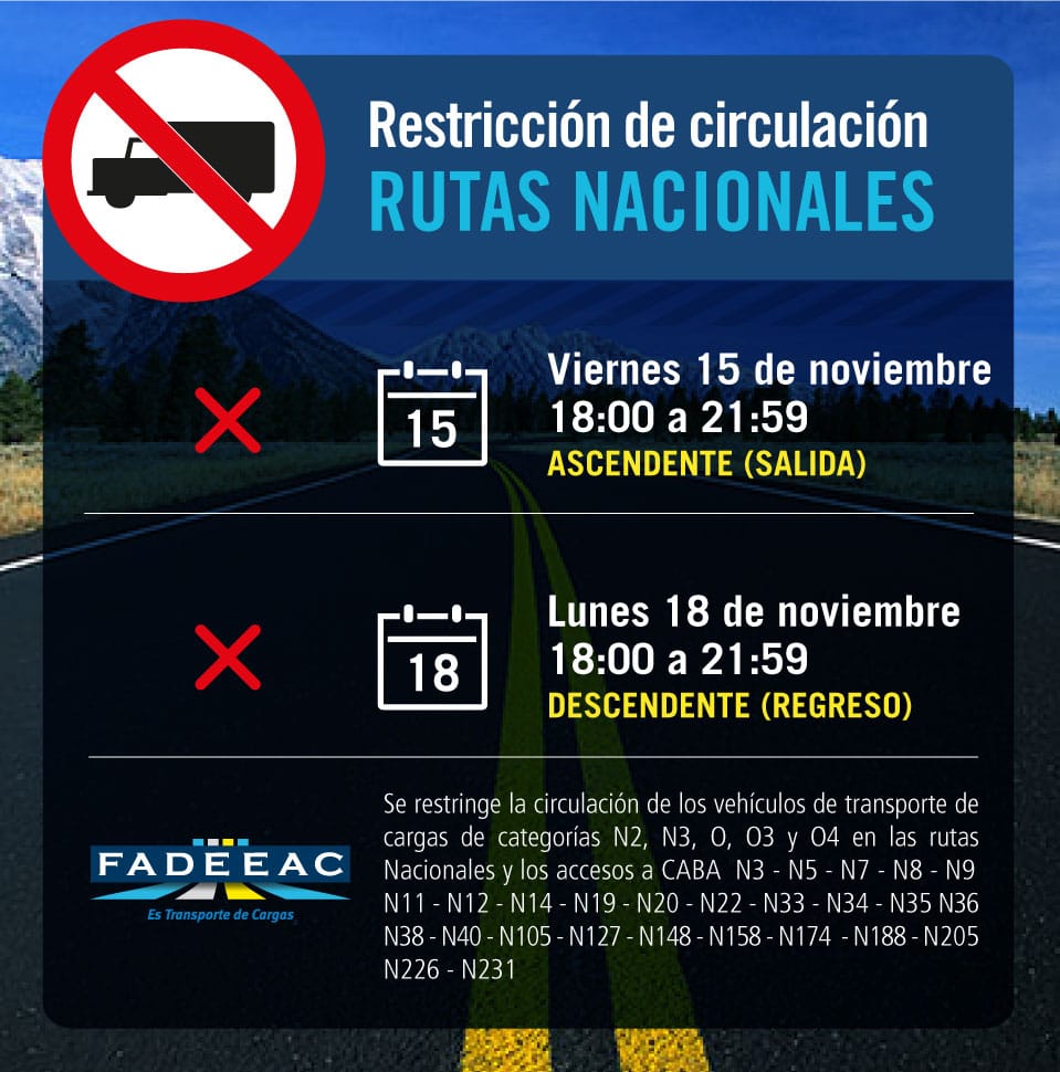 La circulación de camiones de gran porte estará restringida desde hoy y hasta el próximo lunes inclusive en la autopista Buenos Aires-La Plata, la autovía 2 y otras cinco rutas bonaerenses con el objetivo de facilitar el desplazamiento de vehículos el fin de semana largo por la celebración del Día de la Soberanía Nacional.