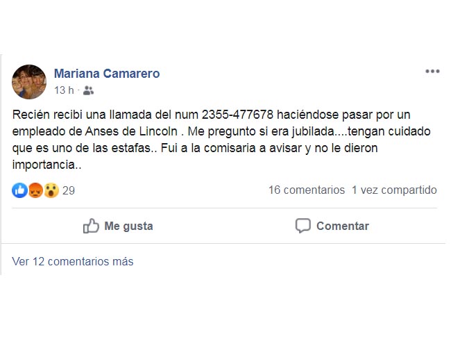 «Recién recibi una llamada del num 2355-477678 haciéndose pasar por un empleado de Anses de Lincoln . Me pregunto si era jubilada….tengan cuidado que es uno de las estafas.. Fui a la comisaria a avisar y no le dieron importancia..»