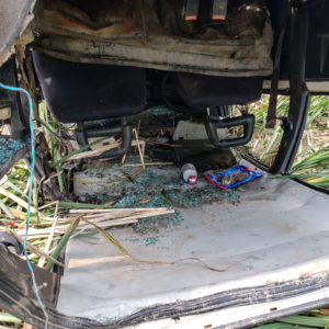 El vehículo es un Fiat Uno color beige, esta sólo con evidencias de haber volcado luego de transitar por el camino de tierra hasta desviarse hacia el zanjón.