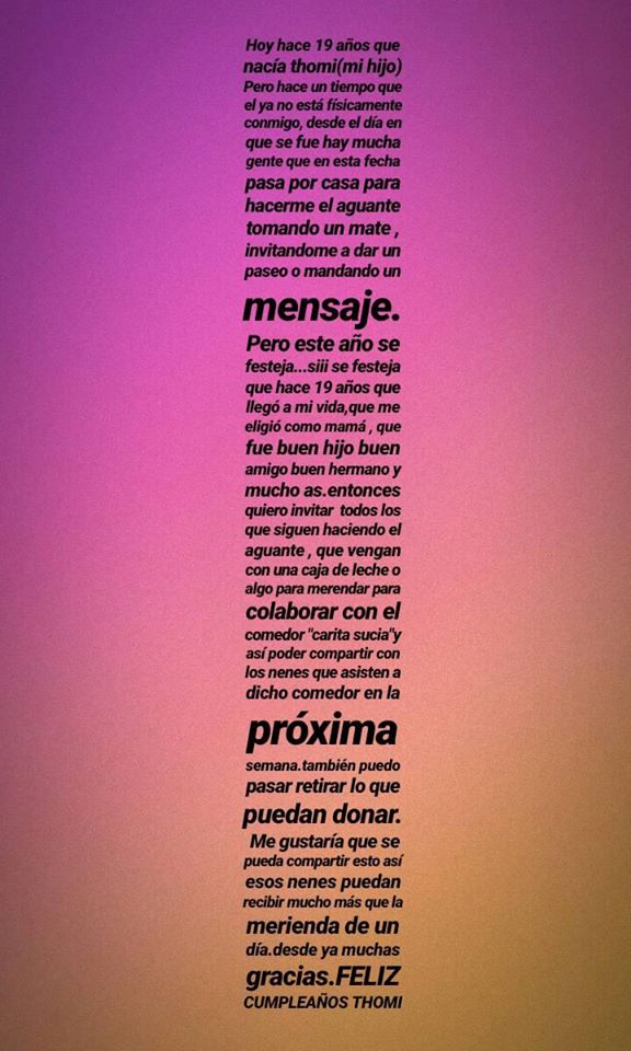 Thomi Oga hace un tiempo partió el cielo y está es una linda manera de recordarlo no les parece? Ya me contacte con la gente del comedor así que vamos a ver que sale de todo esto compartan así los nenes pueden recibir para muchas meriendas más.